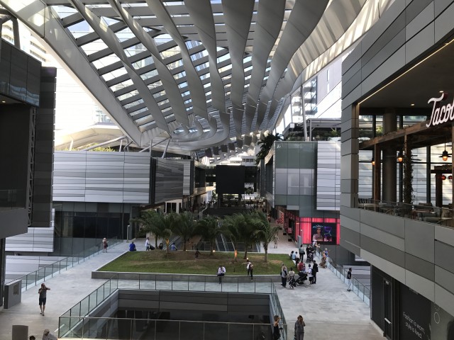 O shopping ocupa os espaços (decks e vãos) que ligam as diferentes torres do complexo e têm um conceito muito interessante: é ao ar livre, mas com a proteção de uma estrutura chamada de “climate ribbon” (fitas climáticas), que permite a entrada de luz natural, protege da radiação direta do sol e conduz as correntes de ar em uma constante ventilação de todo o ambiente. Além disso, a estrutura irá coletar a água das constantes chuvas, que será armazenada para o uso no paisagismo do complexo e para os sistemas de ar condicionado do interior das lojas.